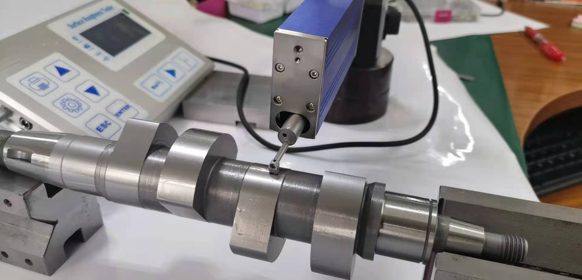 由于曲軸的被測面的位置窄,傳統(tǒng)粗糙度儀的傳感器的移動方向是前后移動的,而粗糙度測量時要求垂直于加工方向的,所以測量曲軸時需要轉(zhuǎn)接桿或直角轉(zhuǎn)接機構(gòu)才能完成測量。這樣傳感器與主機連接點增加了2個,所以造成測出來的值不穩(wěn)定。