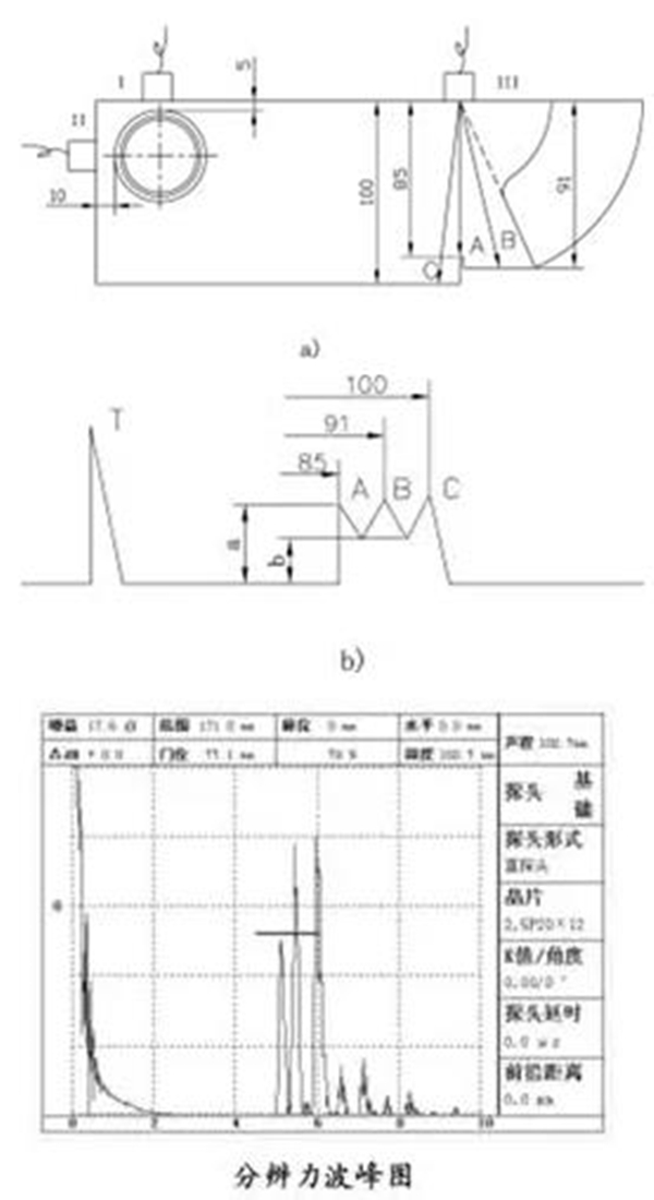 根據(jù)AVG原理,在探頭探傷時(shí)可把R100mm圓弧面視為大平底反射,以此來調(diào)整探測靈敏度。直探頭探傷時(shí)可把厚度為25/100mm的幾個(gè)側(cè)面視為大平底處理,以此來調(diào)整靈敏度。另外,也可以根據(jù)探傷要求,儀測量1.5mm橫通孔反射波來確定靈敏度。