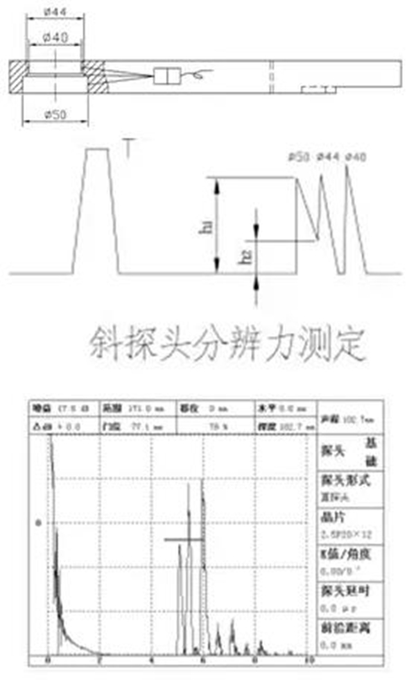 (2)平行移動探頭并調(diào)節(jié)儀器,使50mm、44mm回波等高,如圖所示,其波峰和波谷分別為h1、h2,其分辨力為