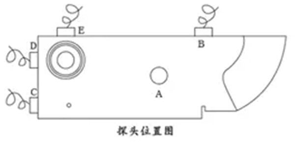 盲區(qū)是指最小的探測距離,測試方法是:將直探頭置于探頭位置圖中D、E位置,測量50mm圓孔反射波。從而可以估計(jì)出盲區(qū)小于等于5mm或大于等于10mm,或者介于兩者之間。