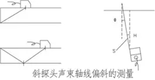 在CSK-ⅠA試塊上厚25mm的平面上,使聲束指向棱邊,對于K值小于等于1的探頭,聲束經(jīng)底面反射指向上棱角;K值大于1的聲束指向下棱角,前后左右擺動探頭,使所測棱邊端角回波幅度最高,固定探頭不動,然后用量角器或適當(dāng)?shù)姆椒y量斜探頭幾何中心聲束軸線與棱邊法線的夾角(例如測量探頭斜面與試塊端面垂直線的夾角),即為聲束軸線偏斜角。應(yīng)當(dāng)注意:斜探頭的聲束擴(kuò)散角較大時(shí),可能影響到最大回波的探測,以致可能產(chǎn)生較大的測量誤差。
