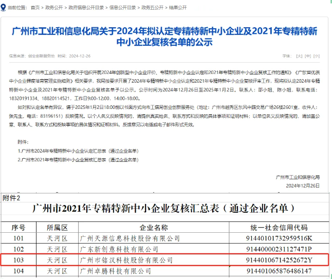 新年伊始,喜訊臨門!近日,廣東省工業(yè)和信息化廳公示了2024年度專精特新中小企業(yè)名單,廣州市銘漢科技股份有限公司再次通過認定,這無疑是對銘漢股份在科技創(chuàng)新、專業(yè)發(fā)展道路上的又一強有力的肯定。