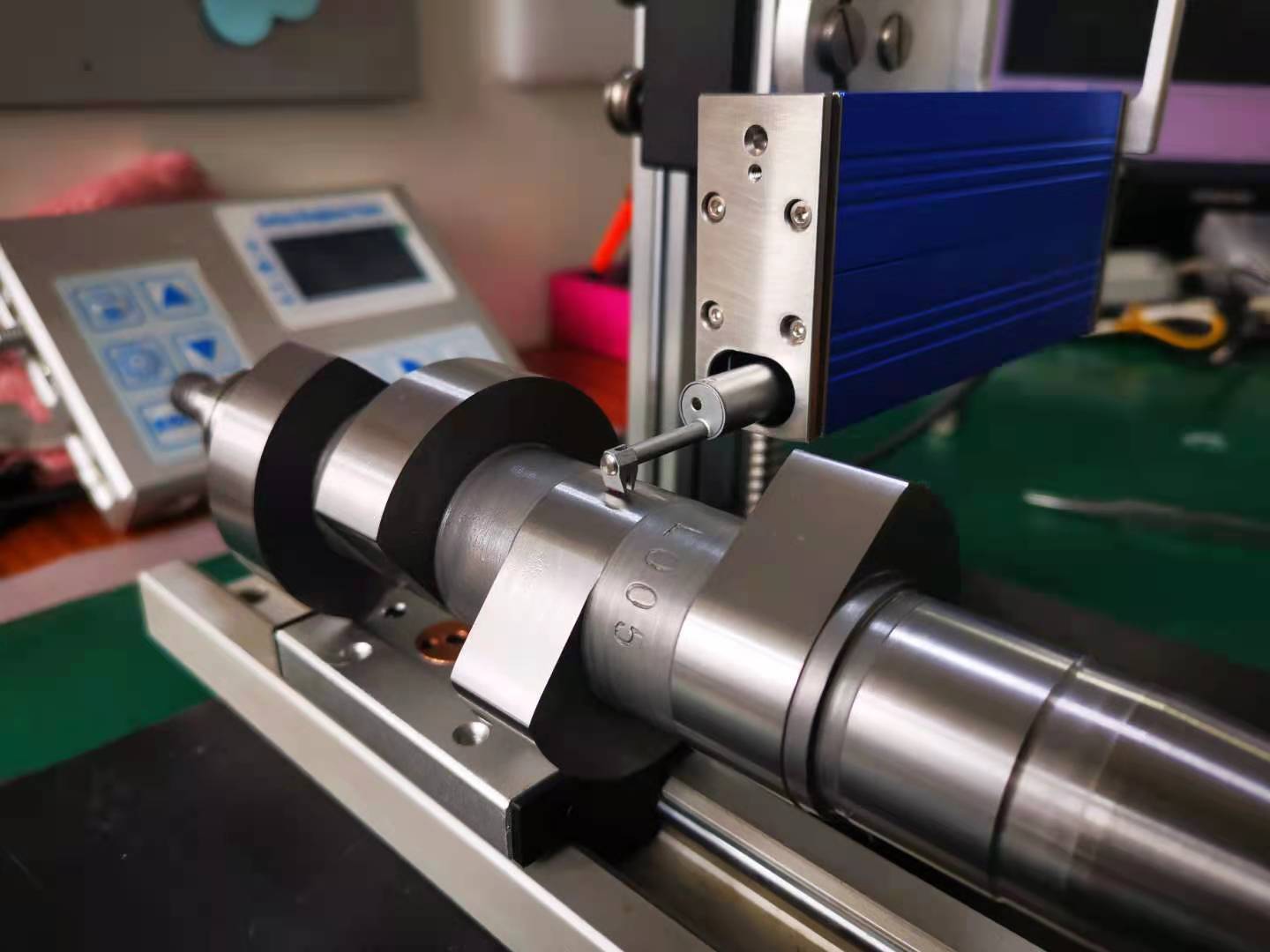 由于曲軸的被測面的位置窄,傳統(tǒng)粗糙度儀的傳感器的移動方向是前后移動的,而粗糙度測量時要求垂直于加工方向的,所以測量曲軸時需要轉(zhuǎn)接桿或直角轉(zhuǎn)接機構(gòu)才能完成測量。這樣傳感器與主機連接點增加了2個,所以造成測出來的值不穩(wěn)定。