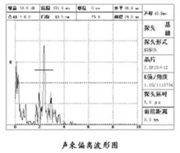 在CSK-ⅠA試塊上厚25mm的平面上,使聲束指向棱邊,對于K值小于等于1的探頭,聲束經(jīng)底面反射指向上棱角;K值大于1的聲束指向下棱角,前后左右擺動探頭,使所測棱邊端角回波幅度最高,固定探頭不動,然后用量角器或適當(dāng)?shù)姆椒y量斜探頭幾何中心聲束軸線與棱邊法線的夾角(例如測量探頭斜面與試塊端面垂直線的夾角),即為聲束軸線偏斜角。應(yīng)當(dāng)注意:斜探頭的聲束擴(kuò)散角較大時(shí),可能影響到最大回波的探測,以致可能產(chǎn)生較大的測量誤差。