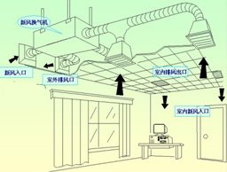 制冷制熱工作原理為:室外新鮮空氣經(jīng)新風(fēng)口進(jìn)入空氣處理室,經(jīng)過過濾器清除掉空調(diào)中的灰塵,再經(jīng)過表冷器、加熱器等設(shè)備的處理,使空氣達(dá)到設(shè)計要求的溫度和濕度后,由送風(fēng)機(jī)經(jīng)風(fēng)量控制系統(tǒng)送入風(fēng)管系統(tǒng)送入消聲裝置降低噪聲后,經(jīng)過各房間風(fēng)量調(diào)節(jié)裝置,由出風(fēng)口送到各空調(diào)房間,吸收了房間里的余熱、余濕后,自回風(fēng)口經(jīng)風(fēng)道排出室外。