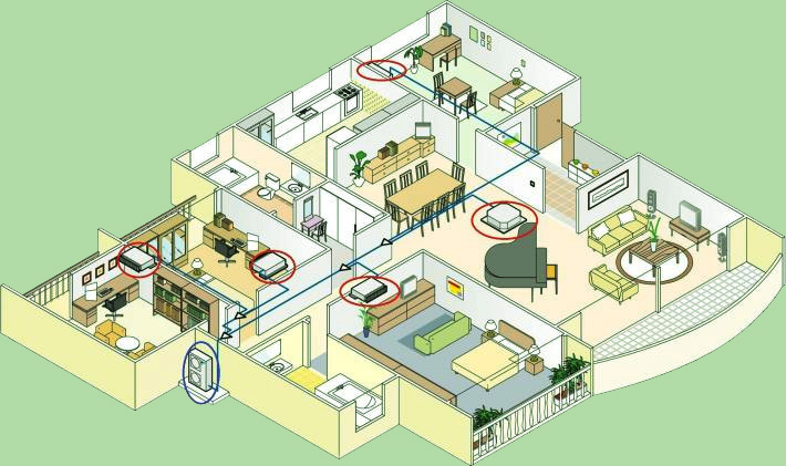 如果將上述空氣處理設(shè)備和制冷機(jī)、風(fēng)機(jī)等組合在一起成為一種整體的機(jī)組,稱為空調(diào)機(jī)組。采用空調(diào)機(jī)組的空調(diào)系統(tǒng)又稱為局部式空調(diào)系統(tǒng),類似于家用分體機(jī)等凈化設(shè)備。具有集中處理新風(fēng)的新風(fēng)處理機(jī)組和風(fēng)管、同時(shí)又在各空調(diào)房間內(nèi)設(shè)有局部處理裝置(稱為末端裝置,如誘導(dǎo)器、風(fēng)機(jī)盤管等)的空調(diào)系統(tǒng)稱為半集中式中央空調(diào)系統(tǒng)。